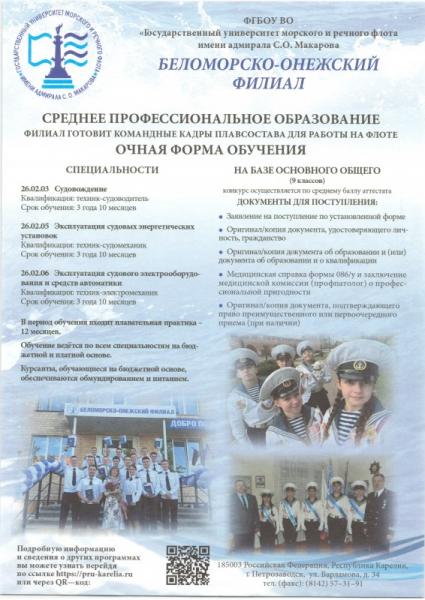 Беломорско-Онежский филиал ФГБОУ ВО «Государственный университет морского и речного флота имени адмирала С.О. Макарова» приглашает выпускников 9-х классов на обучение по программам среднего профессионального образования по следующим специальностям: